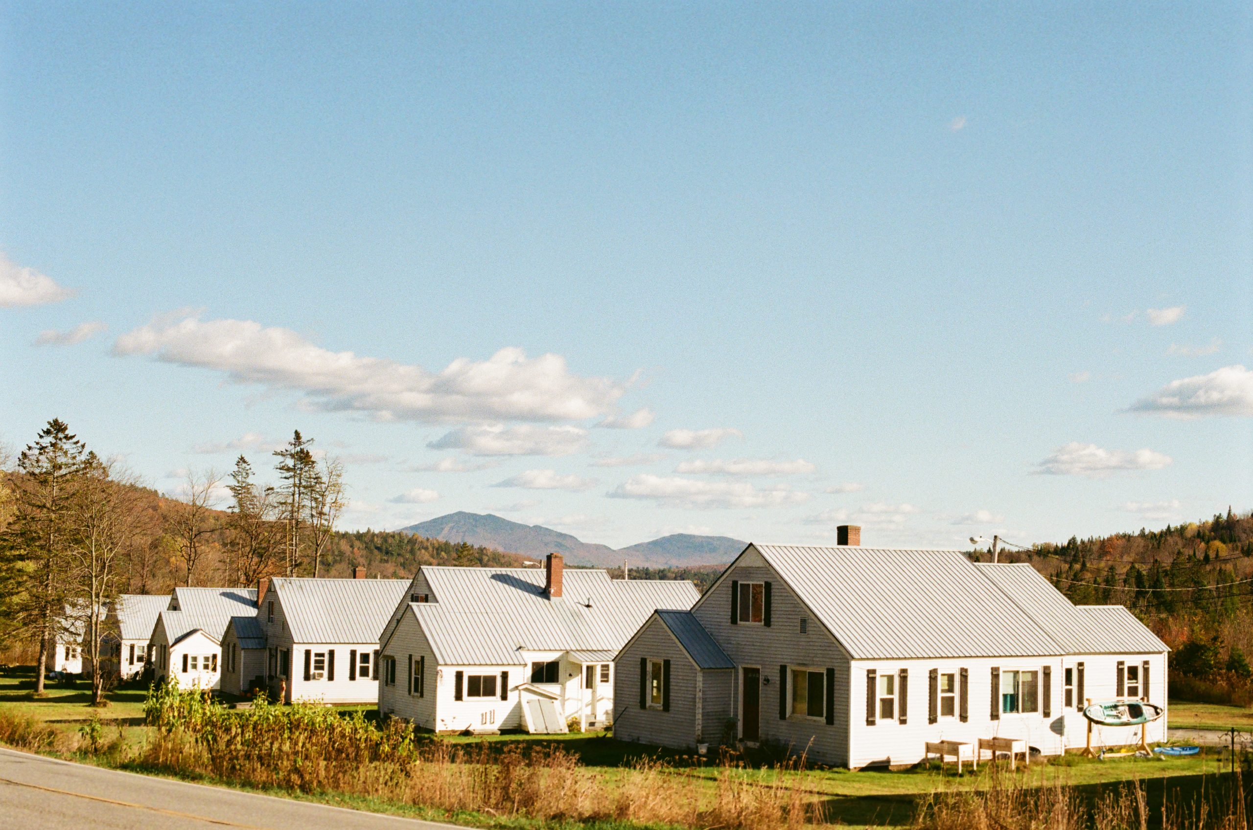 A row of white houses with gray roofs sits along a rural road, surrounded by grass and trees, with distant mountains and a partly cloudy blue sky in the background. | Photo by Millworks Film Photography & Prints