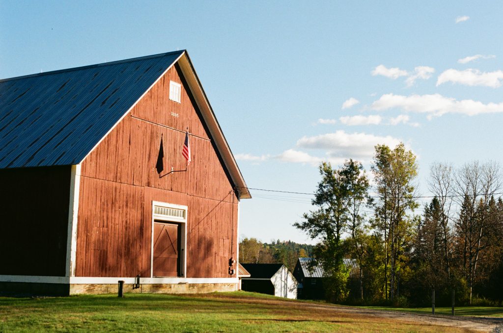 A red barn with a blue roof and an American flag hangs on the front, surrounded by green grass, trees, and a clear blue sky with a few clouds on a sunny day. | Photo by Millworks Film Photography & Prints